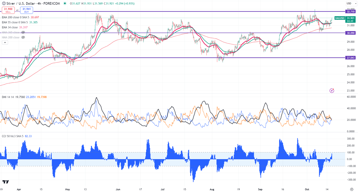 Silver trades higher on declining US yield. It hit a low of $31.8950 at the time of writing and is currently trading around $31.867.