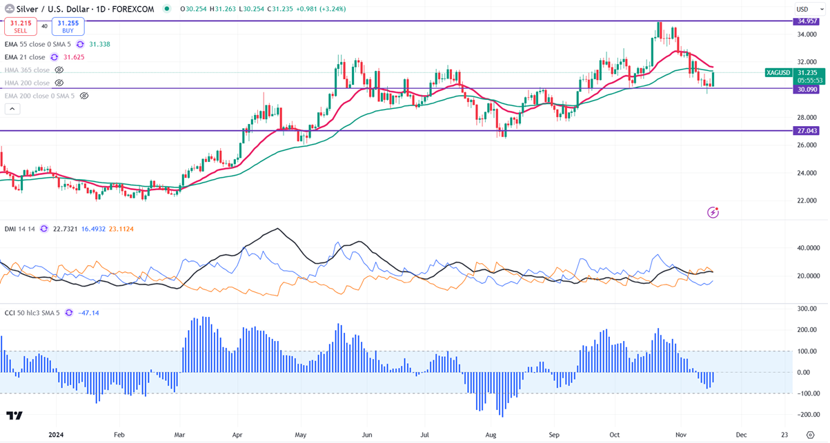 Silver showed a minor pullback as industrial demand increases. It hits a low of $30.18 and is currently trading around $31.22.