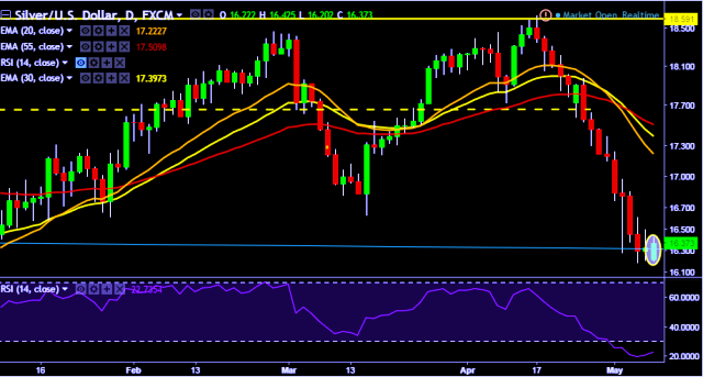We prefer to go long on XAG/USD around $16.36 with stop loss at $16.18 and target of $16.49/$16.86/$16.99.