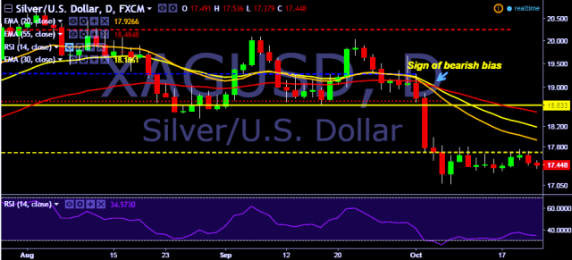 We prefer to go short on XAG/USD around $17.70 with stop loss at 17.75 and target of $17.26/$17.09.