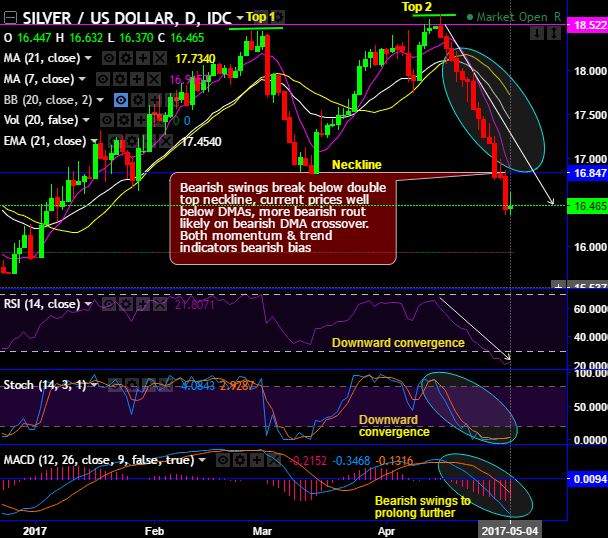 On daily plotting, the double top pattern has occurred in silver price chart with peak 1 at 18.485 (that is where Back to back “shooting star” candle patterns are traced out), peak 2 at 18.647 and neckline at 16.847 levels.