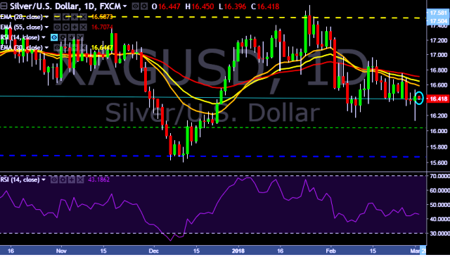 We prefer to take long position in XAG/USD only above $16.48, stop loss $16.32 and target of $16.96.