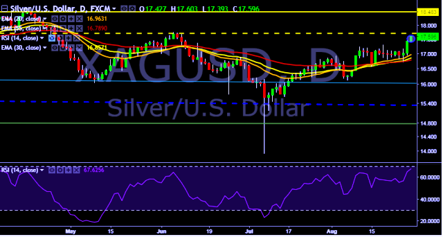 We prefer to go long on XAG/USD around $17.48 with stop loss at $17.18 and target of $17.76/$17.82.