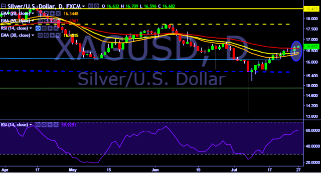 We prefer to go long on XAG/USD around $16.65 with stop loss at $16.48 and target of $16.85.