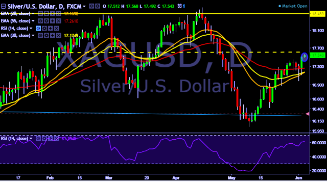 We prefer to go long on XAG/USD only above $17.56 with stop loss at $17.40 and target of $17.72.