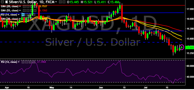 We prefer to take short position on XAG/USD only below $15.42, stop loss $15.60 and target of $15.15/$15.02.
