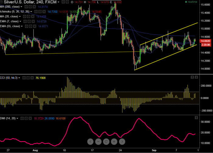 Silver has taken support near trend line support around $14.50 and recovered till $14.75 at the time of wrting. It is facing strong support around $14.55 and any break below will drag the commodity further down till $14 in short term.