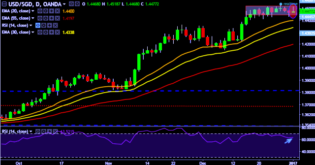 We prefer to go short on USD/SGD around 1.4485, stop loss at 1.4537 and target of 1.4410/1.4357.