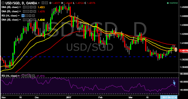 We prefer to take short position in USD/SGD around 1.4020, stop loss 1.4077 and target of 1.3950.