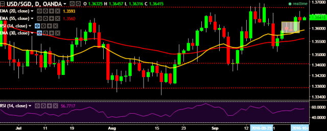 We prefer to go long on USD/SGD only above 1.3646 with stop loss at 1.3587 and target of 1.3698/1.3732.