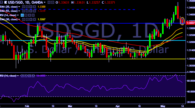 We prefer to take long position on USD/SGD around 1.3335, stop loss 1.3310 and target of 1.3363/1.3438.