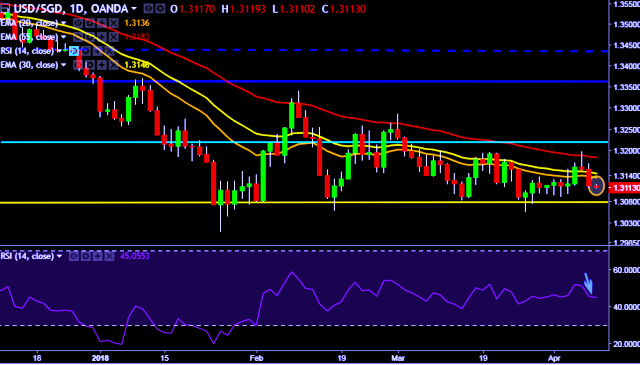 We prefer to take short position on USD/SGD around 1.3110, stop loss at 1.3170 and target of 1.3052.