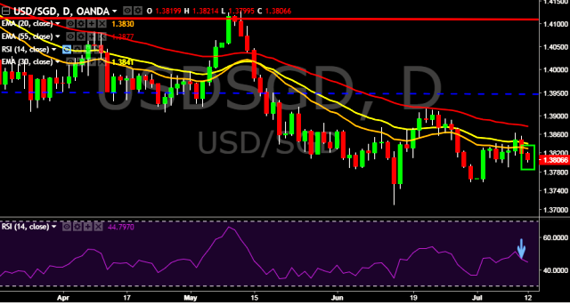 We prefer to take short position in USD/SGD around 1.3810, stop loss at 1.3855 and target of 1.3757.