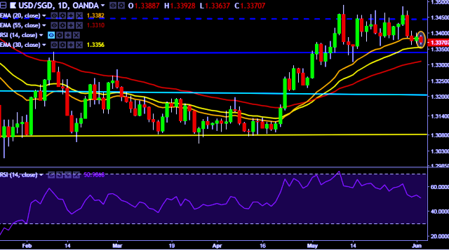 We prefer to take short position on USD/SGD only below 1.3360, stop loss 1.3410 and target of 1.3311.