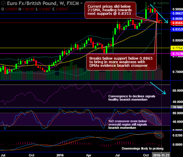 We could still foresee more slumps on cards upon sustenance below 21SMA, downward targets of towards 0.8353 is quite possible by now.