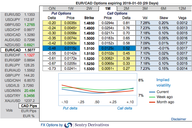 CAD OTC indications: 1M ATM IVs (implied volatilities) of USDCAD are trading in the range of 6.76% - 7.09%, skews are also suggesting the odds on OTM call strikes upto 1.35 levels at this juncture. While 1m EURCAD IVs have been well balanced on either side, indicating the risk sentiments are skewed for both bullish and bearish risks.