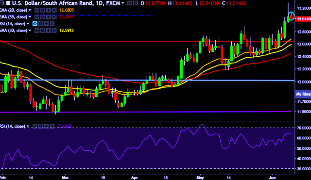 - USD/ZAR is currently trading around 13.00 levels.