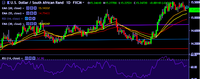 We prefer to take long position on USD/ZAR only above 15.32, stop loss at 15.12 and target of 15.46/15.70.