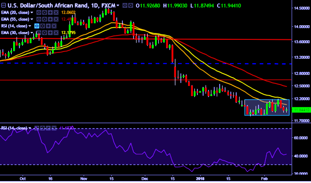 We prefer to take short position on USD/ZAR only below 11.87, stop loss at 12.15 and target of 11.73.