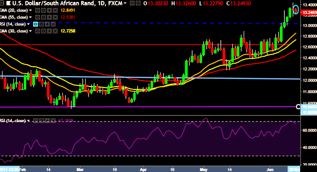 We prefer to take long position on USD/ZAR around 13.18, stop loss 13.13 and target of 13.43/13.53.