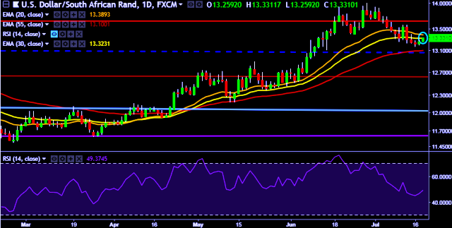 We prefer to take short position on USD/ZAR only below 13.25, stop loss 13.40 and target of 12.99.