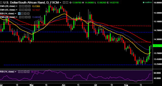 We prefer to go long on USD/ZAR only above 14.02, stop loss at 13.65 and target of 14.48.