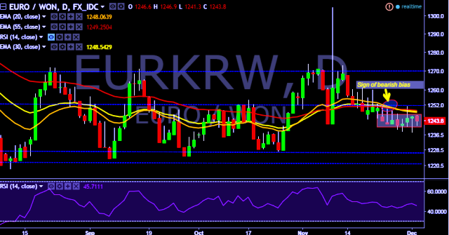 We prefer to go short on EUR/KRW around 1,245, with stop loss at 1,251 and target of 1,237/1,229/1,225.