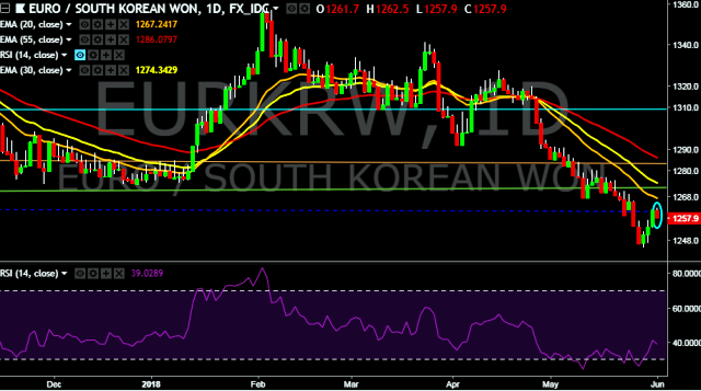 We prefer to take long position on EUR/KRW only above 1,257, stop loss at 1,245 and target of 1,280.
