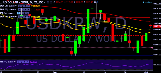 We prefer to go short on USD/KRW around 1,115 with stop loss at 1,122 and target of 1,107/1,101.