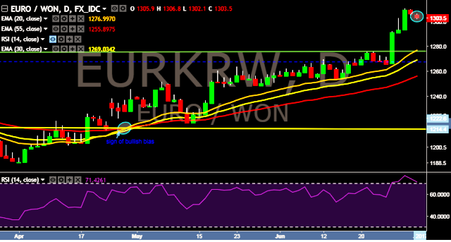 We prefer to take short position in EUR/KRW around 1,305, stop loss at 1,311 and target of 1,293/1,275.