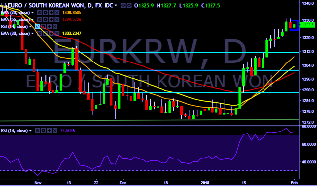 We prefer to take long position on EUR/KRW only above 1,330, stop loss at 1,320 and target of 1,338/1,355.