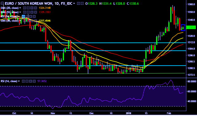 We prefer to take short position on EUR/KRW only below 1,328, stop loss at 1,338 and target of 1,308.