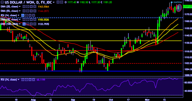 - USD/KRW is currently trading around 1,180 levels.