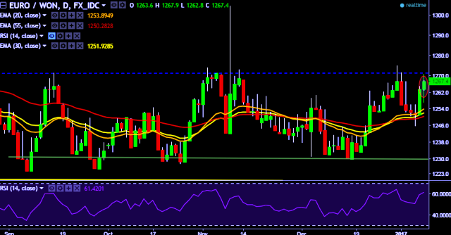 We prefer to go long on EUR/KRW only above 1,267 with stop loss at 1,250 and target of 1,275/1,287.