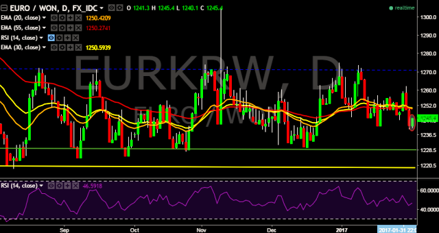 We prefer to take long position in EUR/KRW around 1,242, stop loss at 1,238 and target of 1,252/1,262.