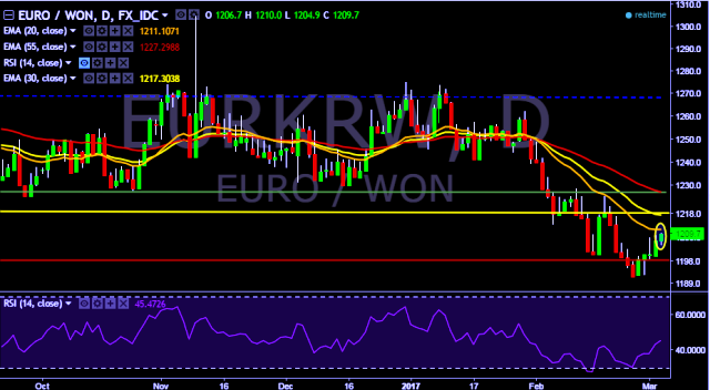 We prefer to take long position in EUR/KRW around 1,207, stop loss at 1,199 and target of 1,225.