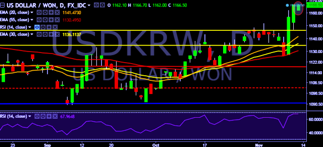 We prefer to go long on USD/KRW around 1,158, stop loss 1,145 and target 1,168/1,176.