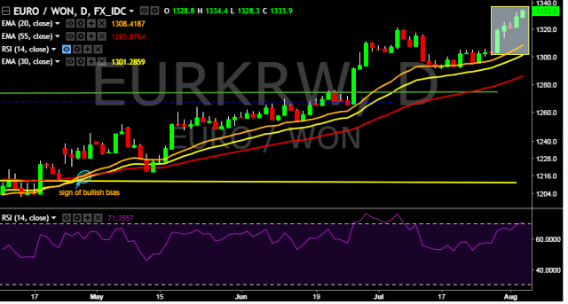 We prefer to take long position on EUR/KRW around 1,330, stop loss at 1,321 and target of 1,351.