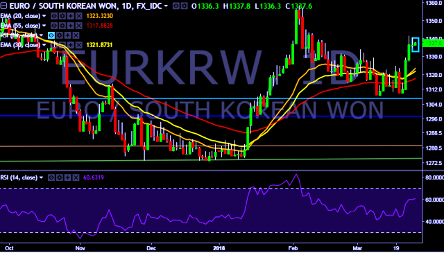 We prefer to take long position on EUR/KRW around 1,336, stop loss at 1,327 and target of 1,342/1,356.
