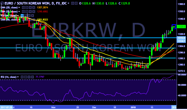 We prefer to take long position on EUR/KRW around 1,326, stop loss at 1,320 and target of 1,338.