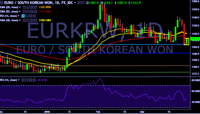 We prefer to take long position on EUR/KRW only above 1,315, stop loss at 1,307 and target of 1,324/1,332/1,340.