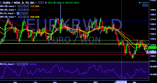 We prefer to take long position in EUR/KRW around 1,210, stop loss at 1,205 and target of 1,219.