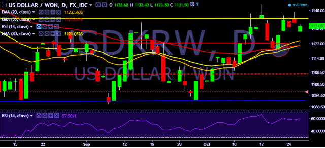 We prefer to go long on USD/KRW only above 1,135, stop loss 1,117 and target 1,152/1,168.