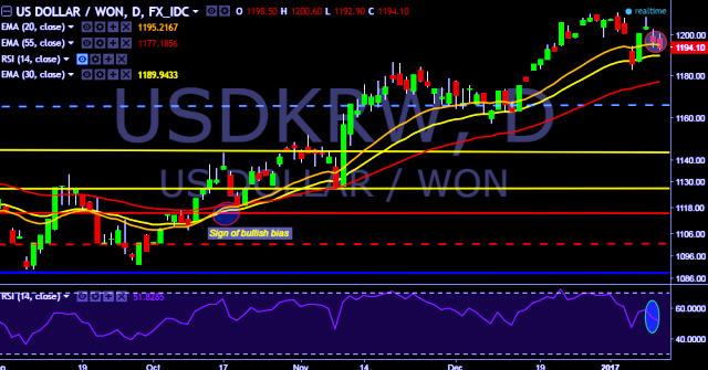We prefer to go short on USD/KRW around 1,195 with stop loss at 1,203 and target of 1,182.