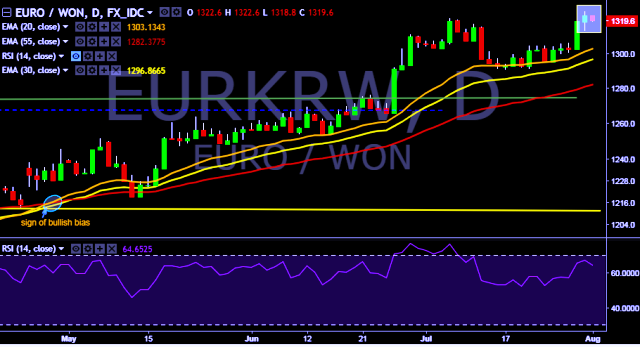 We prefer to take long position on EUR/KRW only above 1,322, stop loss at 1,313 and target of 1,338/1,351.