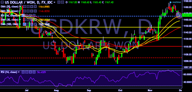 We prefer to go short on USD/KRW only below 1,165, stop loss at 1,172 and target of 1,160/1,152.