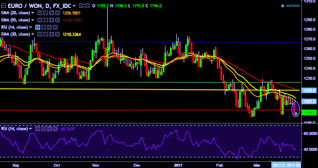 We prefer to take short position in EUR/KRW only below 1,193, stop loss at 1,205 and target of 1,178.