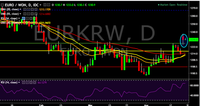 We prefer to take long position in EUR/KRW around 1,230, stop loss at 1,224 and target of 1,238/1,252.