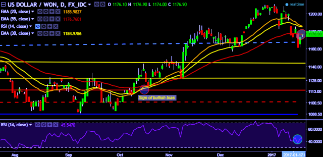 We prefer to go long on USD/KRW around 1,174 with stop loss at 1,162 and target of 1,185/1,200.
