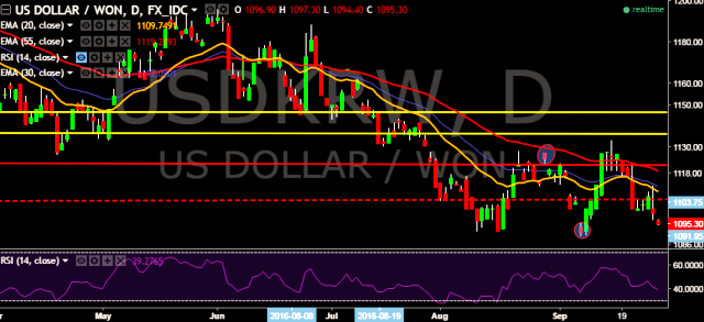 We prefer to go short on USD/KRW around 1,100 with stop loss at 1,107 and target of 1,089/1,078.